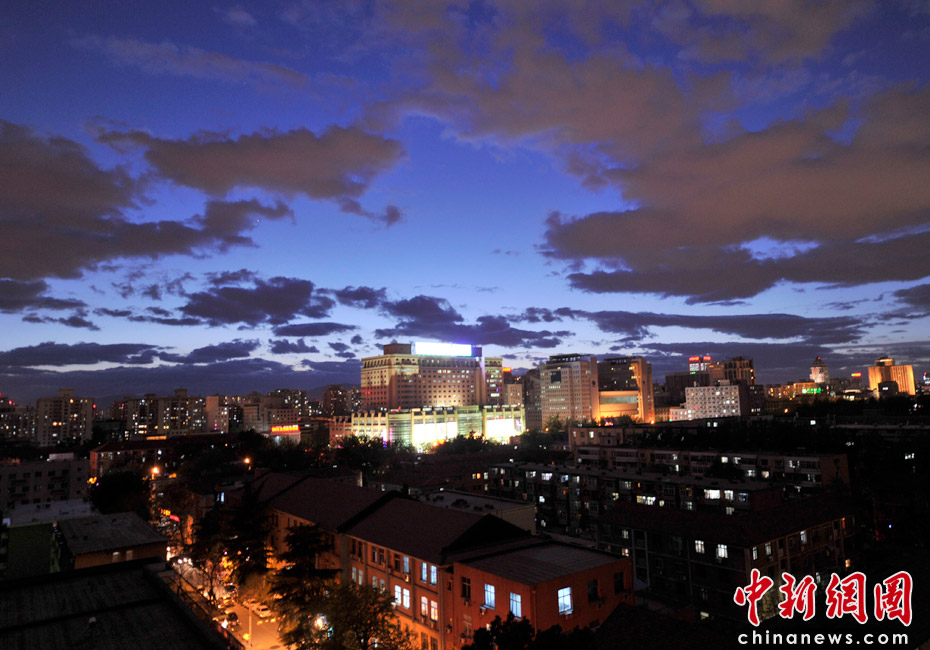 5月5日立夏,京城降雨今晨剛剛結(jié)束,霧氣伺機又起。傍晚時分,隨著四級北風(fēng)的到來,京城天氣逐漸轉(zhuǎn)晴,霧氣慢慢消散天空彤云密布夜色瑰麗。中新網(wǎng)記者 金碩 攝