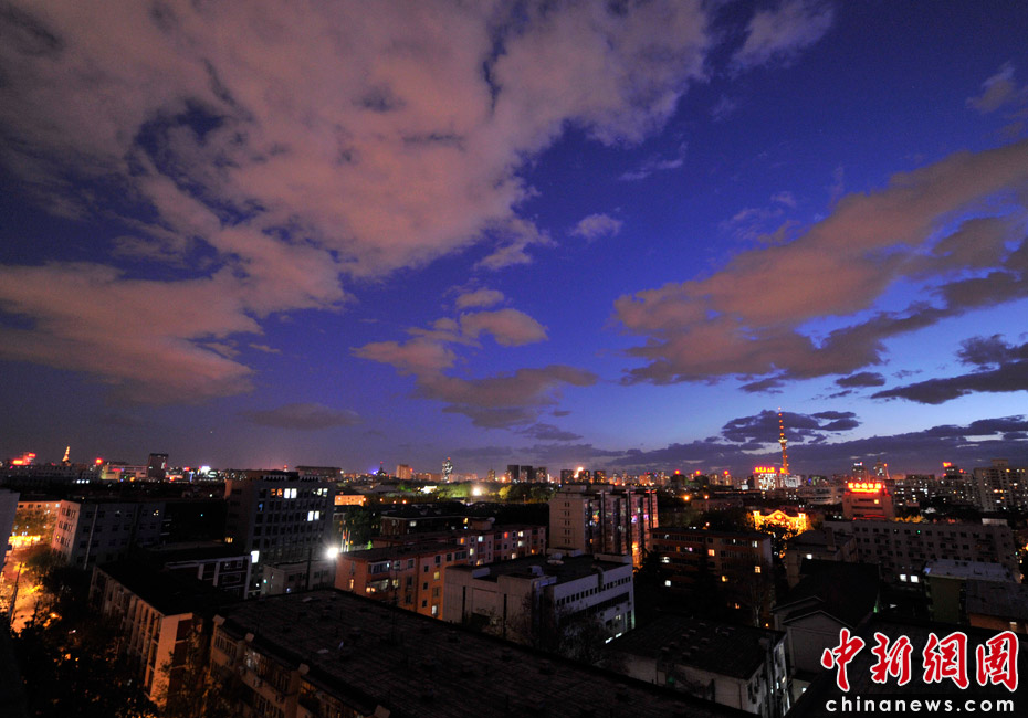 5月5日立夏,京城降雨今晨剛剛結(jié)束,霧氣伺機(jī)又起。傍晚時(shí)分,隨著四級北風(fēng)的到來,京城天氣逐漸轉(zhuǎn)晴,霧氣慢慢消散天空彤云密布夜色瑰麗。中新網(wǎng)記者 金碩 攝