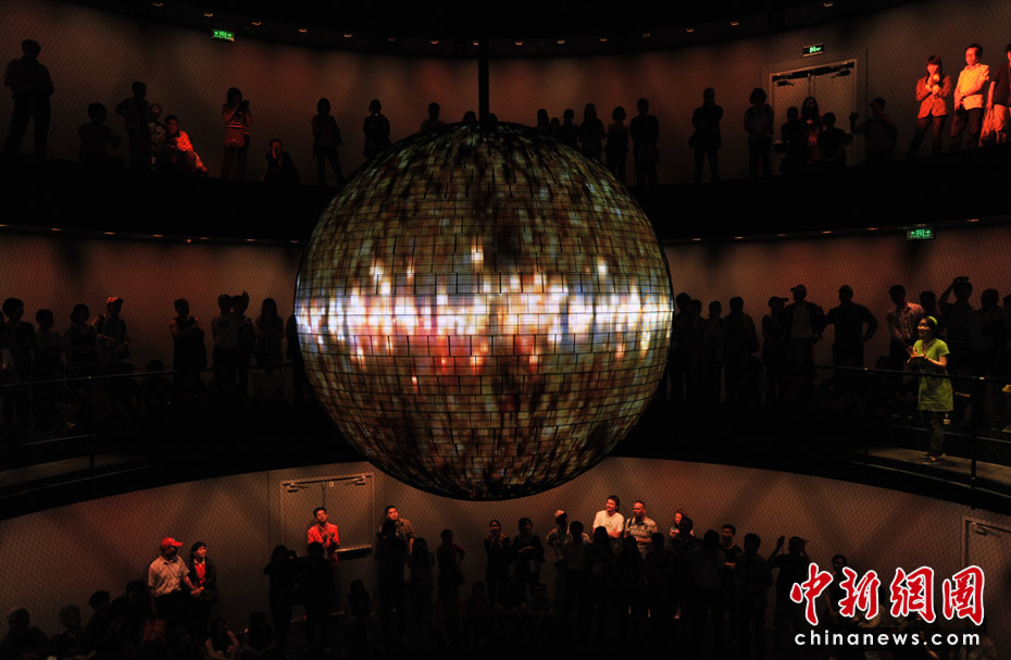 德國館的高潮就是它的最后部分“動力之源”。可以容納600人的動力之源大廳圓形環廊是一個圓錐形空間,中間懸掛著一個重達1.5噸、直徑達3米的巨大金屬球,四周則有一圈供游客駐足的走廊。黑漆漆的大廳里,兩個虛擬主持人邀請觀眾同時大聲吶喊。隨著吶喊聲的加大,動力球慢慢擺動起來,聲音越大擺動幅度越大,甚至繞圈飛行。圓球表面40萬根發光的LED管,逐漸閃現出德國人對未來城市生活的暢想畫面。這是一場7分鐘的互動體驗。在這里觀眾才是主角。中新網記者 王紅綱 攝