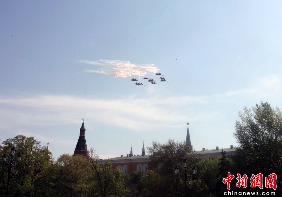 5月9日,俄羅斯在莫斯科紅場(chǎng)舉行盛大的閱兵式,慶祝衛(wèi)國(guó)戰(zhàn)爭(zhēng)勝利65周年。莫斯科時(shí)間5月9日上午10點(diǎn)(北京時(shí)間9日下午2點(diǎn))許,閱兵式正式開始。圖為空中梯隊(duì)飛越紅場(chǎng)上空。中新網(wǎng)記者 張朔 攝