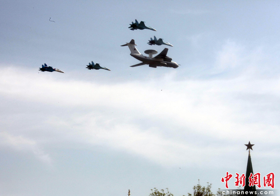 5月9日,俄羅斯在莫斯科紅場舉行盛大的閱兵式,慶祝衛國戰爭勝利65周年。莫斯科時間5月9日上午10點(北京時間9日下午2點)許,閱兵式正式開始。2--圖為空中梯隊穿越紅場上空接受檢閱。張朔 攝