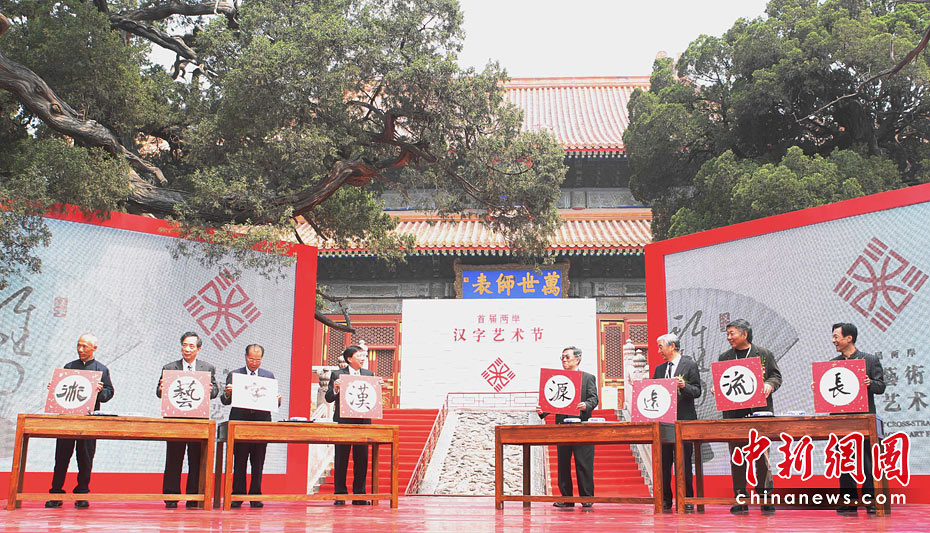 5月15日,首屆“兩岸漢字藝術節”新聞發布會在北京孔廟舉行。原文化部長、著名作家王蒙與臺灣文化總會會長劉兆玄等共同書寫漢字——“漢字藝術源遠流長”。 中新社發 蘇丹 攝