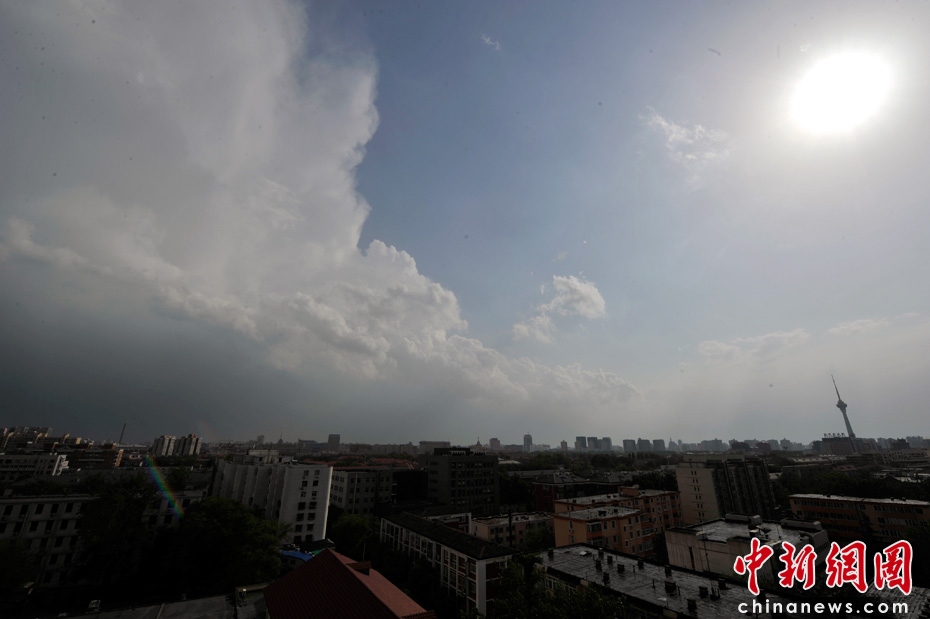 5月18日16時許,伴隨陣陣雷聲京城突降大雨,降雨過后東部天空仍籠罩著密布的烏云,而此時西邊則出現了落日。中新網記者 金碩 攝