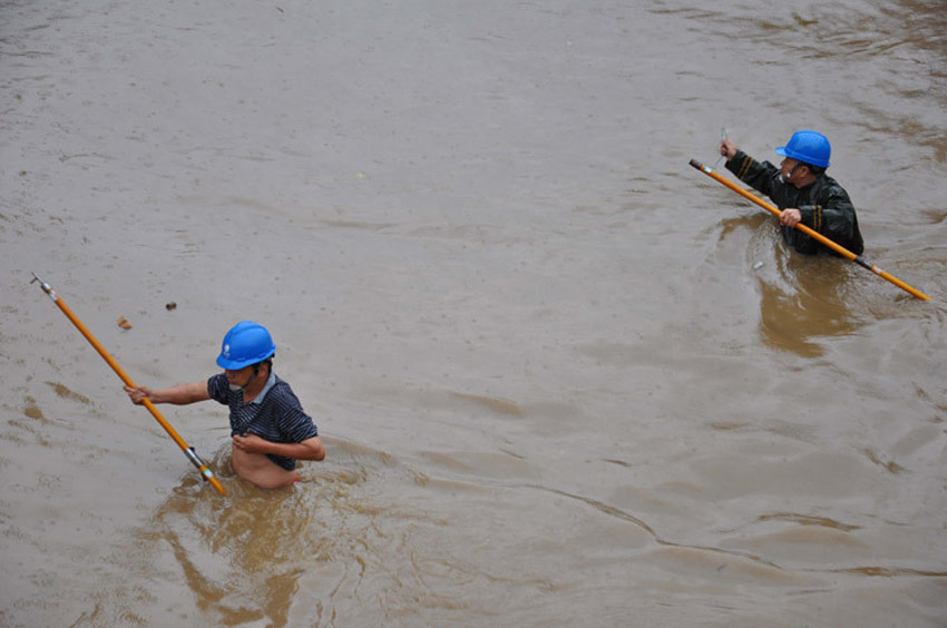 5月18日,婺源縣兩名電力工人走在齊腰深的洪水中。單長華 攝 (圖片來源:新華網(wǎng))