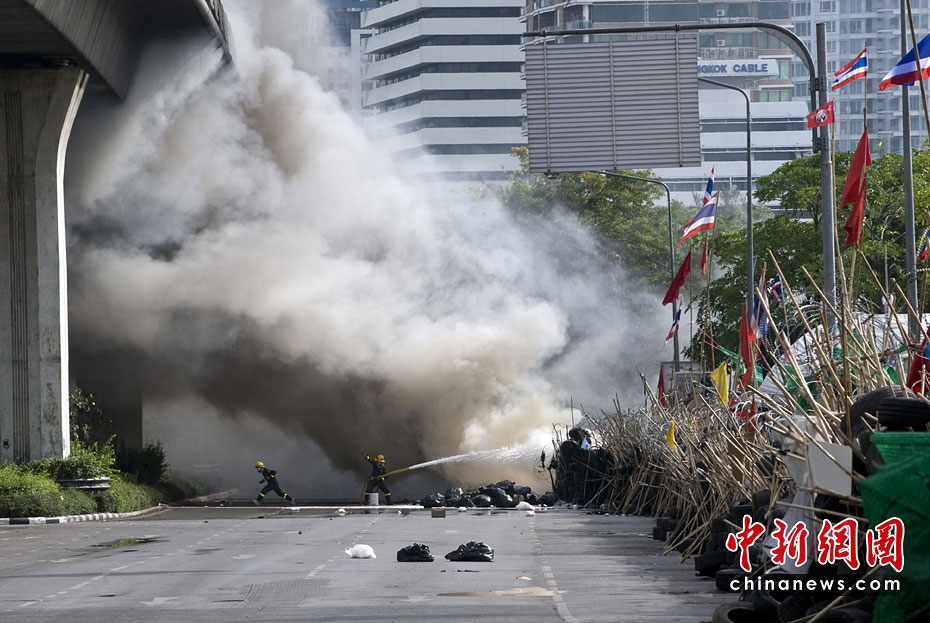 19日泰國軍方對聚集在首都曼谷市示威的反政府“紅衫軍”展開了驅散行動。軍方裝甲車已突破“紅衫軍”所筑路障,且至少有3人被槍擊中。圖片來源:中國新聞網