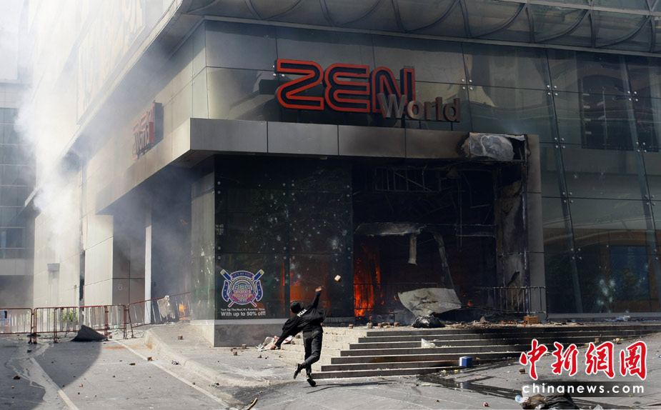 泰國軍方19日清場,希望將陷入內(nèi)戰(zhàn)邊緣的曼谷拯救出來,雖然紅衫軍節(jié)節(jié)敗退,但有激進(jìn)分子未肯罷休,四處放火,電視臺、股票交易所、電力公司、幾間銀行、商場戲院都遭殃,商場和便利店亦成為搶掠目標(biāo)。據(jù)報曼谷有27處地方起火,泰國最大的商場Central World、Siam Square和Siam Paragon三大購物中心被縱火,其中Central World燒通頂,據(jù)報快將倒塌。