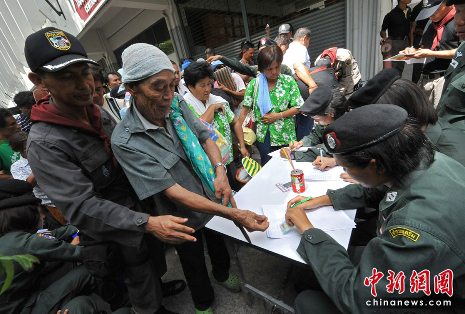 5月20日,數(shù)千名結(jié)束集會(huì)的外地“紅衫軍”示威者在曼谷拉差巴頌地區(qū)接受登記和安全檢查后,乘坐政府安排的車輛返回家鄉(xiāng)。