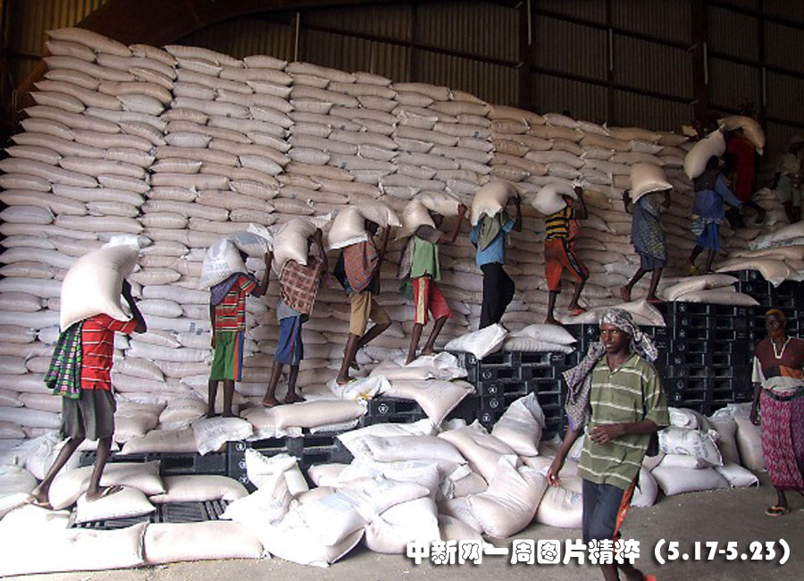 5月19日在索馬里摩加迪沙,工人們在一間倉庫內搬運玉米。聯合國世界糧食計劃署的糧食供給將發放到那些貧困以及在國內流離失所的人手中。