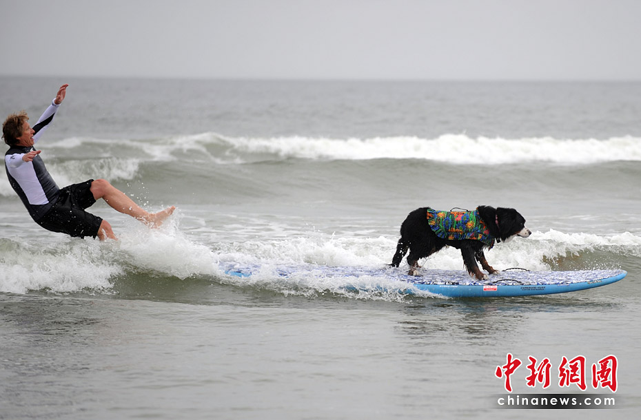 5月22日,美國加利福尼亞州圣迭戈舉行了一場妙趣橫生的狗狗沖浪比賽。圖片來源:中國新聞網(wǎng)