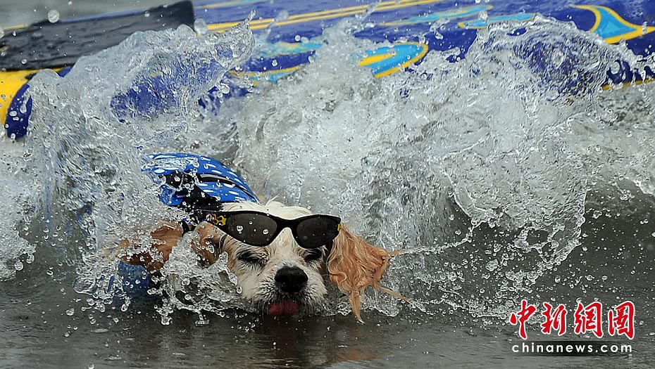 5月22日,美國加利福尼亞州圣迭戈舉行了一場妙趣橫生的狗狗沖浪比賽。圖片來源:中國新聞網