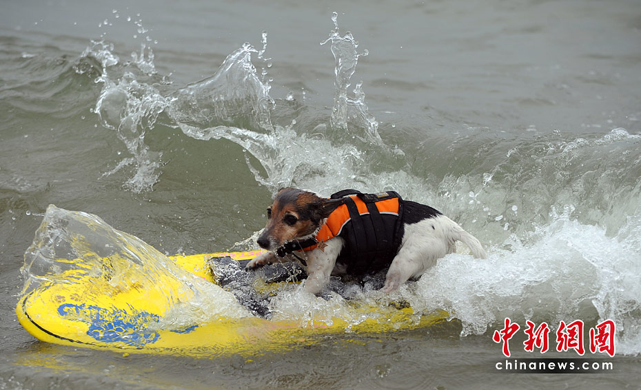 5月22日,美國(guó)加利福尼亞州圣迭戈舉行了一場(chǎng)妙趣橫生的狗狗沖浪比賽。圖片來(lái)源:中國(guó)新聞網(wǎng)