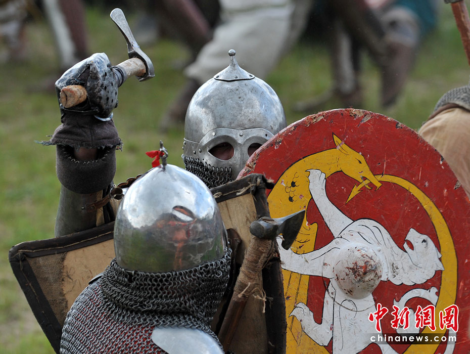 5月22日,在烏克蘭基輔郊區舉行的基輔羅斯節表演上,演出者再現了十三世紀的基輔羅斯戰役歷史場面。圖片來源:中國新聞網