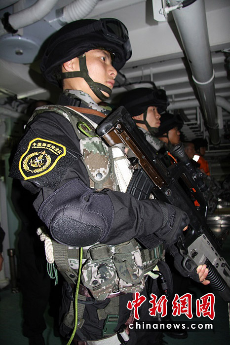 3月7日,新加坡海峽特戰(zhàn)隊員在船艙中集合。胡軍 攝