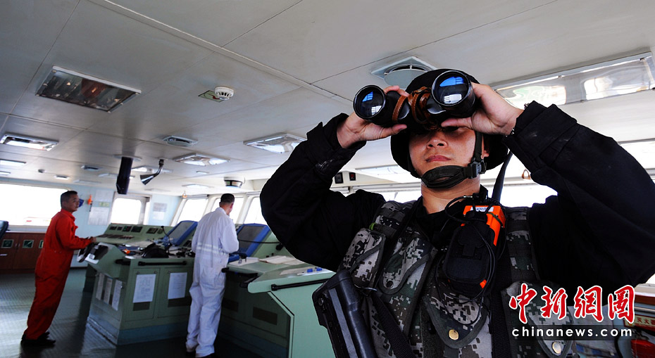 4月13日上午9時,特戰隊員在駕駛室瞭望警戒。船長戴濤說,有特戰隊員在身邊,即使航行在海盜猖獗的亞丁灣海域,心里也特別踏實。江山 攝