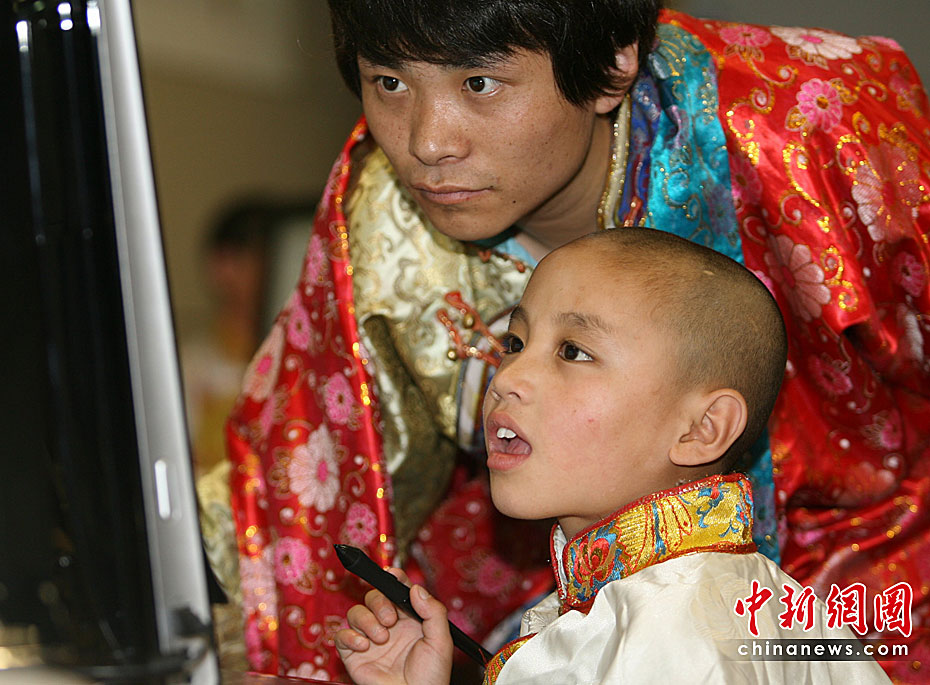 5月31日,玉樹地震孤兒多杰仁青在老師的指導(dǎo)下在北京國家圖書館體驗(yàn)新開通的少兒數(shù)字圖書館,迎接六一兒童節(jié)。這批玉樹孤兒共23名,于5月23日抵京,由“中華少年兒童慈善救助基金會(huì)”安置。在北京度過“六一”后,他們還將休整3個(gè)月,待災(zāi)區(qū)情況穩(wěn)定后,中華兒慈會(huì)將與當(dāng)?shù)氐拿裾块T協(xié)商,在征求孤兒本人意愿的基礎(chǔ)上,或讓他們返回原地上學(xué),或者在內(nèi)地長期居住。基金會(huì)將一直支持他們到18歲成人。中新社發(fā) 蘇丹 攝