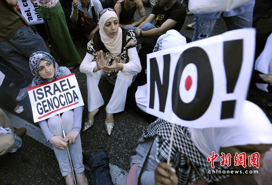 以色列海軍31日對國際人道救援船隊發動襲擊,船上至少有9名支持巴勒斯坦的活動人士被以軍打死,眾多國家和國際組織紛紛表示“震驚”,多國民眾走上街頭,對襲擊事件表示抗議。圖為在西班牙馬德里,民眾在街頭游行抗議。