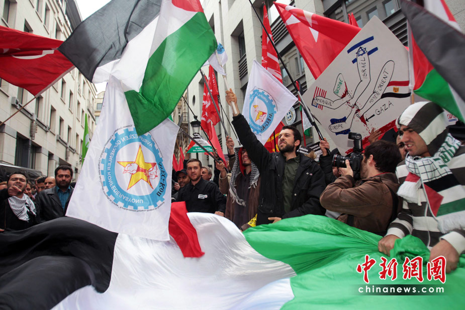 以色列海軍31日對國際人道救援船隊發動襲擊,船上至少有9名支持巴勒斯坦的活動人士被以軍打死,眾多國家和國際組織紛紛表示“震驚”,多國民眾走上街頭,對襲擊事件表示抗議。圖為在比利時布魯塞爾,民眾在街頭游行抗議。