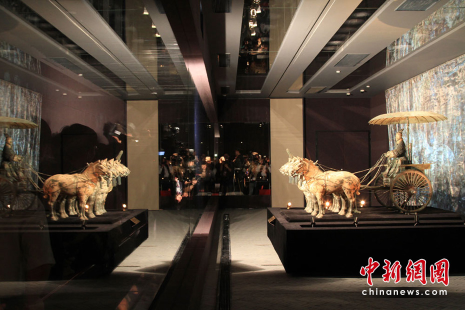 6月1日,秦始皇帝陵出土的“一號銅車馬”亮相世博會中國國家館,這是它出土30年以來第一次“駛出”陜西。這件國寶級文物在地下歷經了2200多個春秋,于1980年出土,通體彩繪,為雙輪,單轅,駟馬系駕,總重約1061公斤。銅車馬共由3500多個零件組成,除一些金、銀飾件外,其余全部為青銅鑄件。中新社記者 殷春永 攝