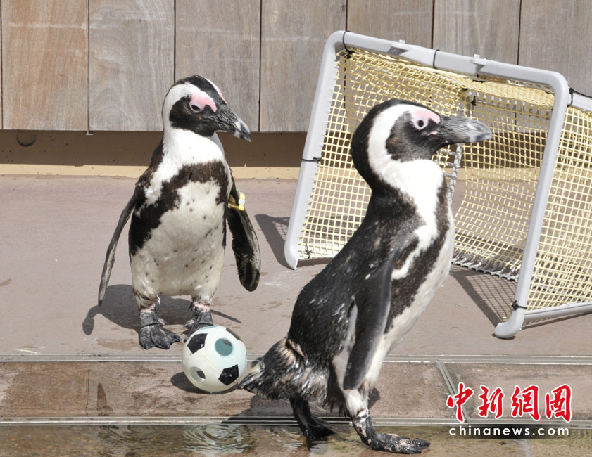 6月1日,在日本東京一家海洋館里,幾只企鵝“披掛上陣”,進行了一場別開生面的足球賽,迎接世界杯。