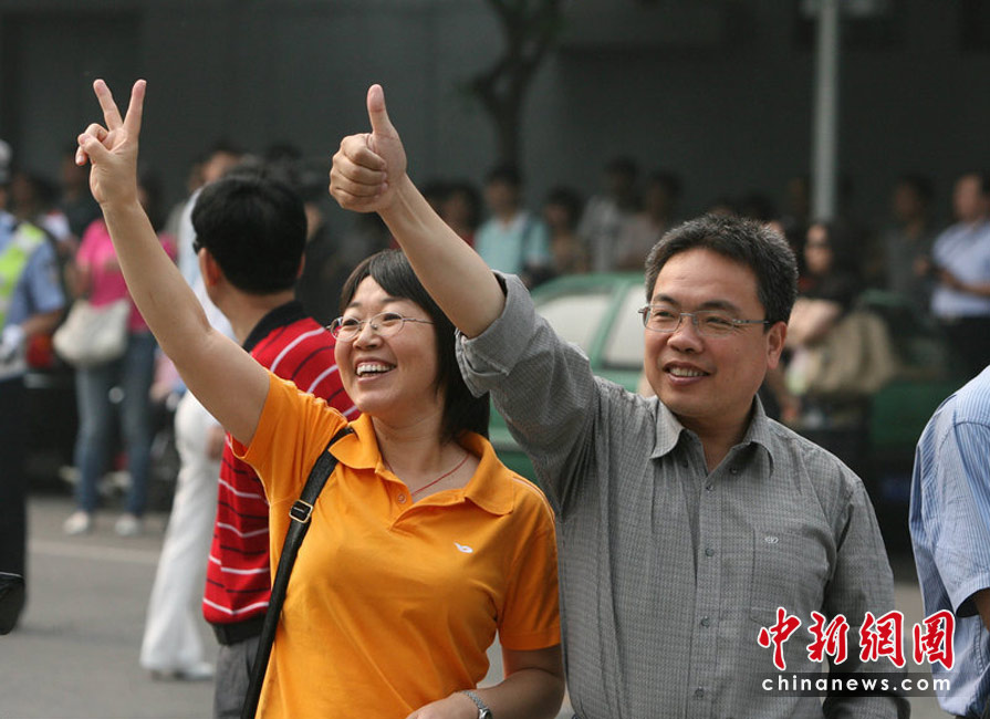 6月7日,為期兩天的2010年普通高等學校招生全國統一考試開考,全國將有957萬考生走進考場。圖為兩位家長在目送孩子進入考場后,不忘做出鼓勵的手勢。楊登峰攝