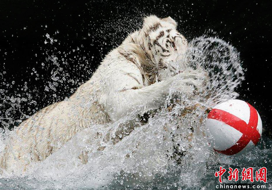 2010年6月7日,美國南卡羅來納州美特爾海灘,在世界杯即將開幕之際,一歲的小白虎Sundaram和孟加拉虎Mukti率先在水里上演了一出足球大戲。英格蘭隊首戰將對陣美國隊,因此足球外側也被印上了英格蘭旗的標志。cfp