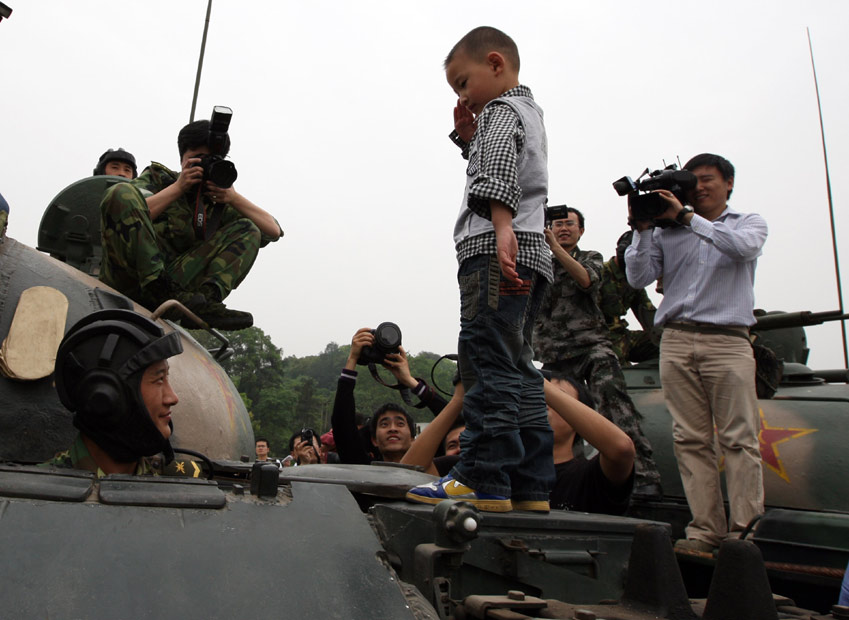 4月25日,汶川大地震幸存者“敬禮娃娃”郎崢一家來到成都軍區(qū)駐渝某部營區(qū),感謝該部戰(zhàn)士在廢墟中救出郎崢的性命。2008年5月13日晨,3歲的郎崢被解放軍官兵從廢墟里救出后,躺在一塊小木板做的臨時擔(dān)架上,用他稚嫩的右手向8位抬著他的解放軍叔叔敬了個少先隊禮,他的舉動引起社會各界高度關(guān)注,被媒體稱為“敬禮娃娃”。圖為郎崢在營區(qū)內(nèi)見到夢寐以求的坦克,爬到坦克車上用一個軍禮向解放軍叔叔表示感謝。中新社發(fā) 郭晉嘉 攝