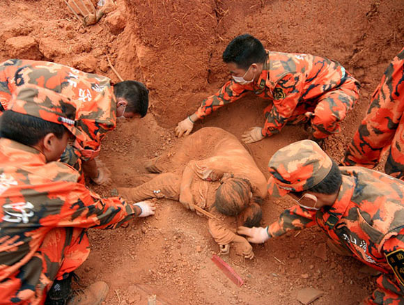 2008年8月30日16時30分,四川攀枝花市、會理縣交界處發生6.1級地震,造成36人死亡,675人受傷。圖為消防官兵在倒塌的土墻下刨出兩名罹難者的遺體。作者:鄒森 中國