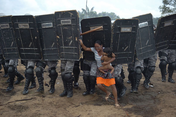 3月11日,在巴西馬瑙斯市郊,一名“無土地農民運動組織”婦女試圖反抗武裝警察的驅逐。巴西無土地農民組織與警察發生沖突,反抗警方將他們驅逐出自己的住所。