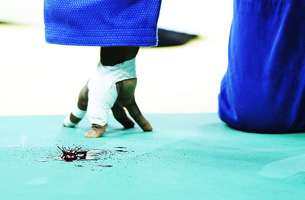 2008年8月11日,北京,海地柔道選手在奧運會女子57公斤級柔道比賽中頭部受傷,血染賽場。作者:吳曉凌 中國