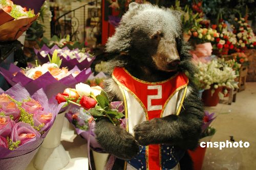 2月11日中午,在浙江省溫嶺市萬壽路的含羞草花店里,來了一位特殊的“客人”——溫嶺動物園的黑熊,它是為2月14日的“情人節”“準備”鮮花的。動物園的飼養說,每年“情人節”前,都要陪這位“黑熊大哥”上街“選購”鮮花。中新社發 江勇兵 攝