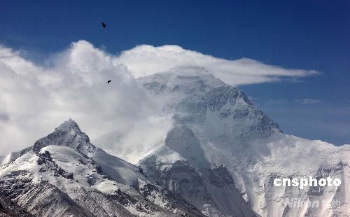 5月4日,在珠峰大本營連續降雪后,雄偉的珠穆朗瑪峰于短暫的晴空中現出巍峨的身影。