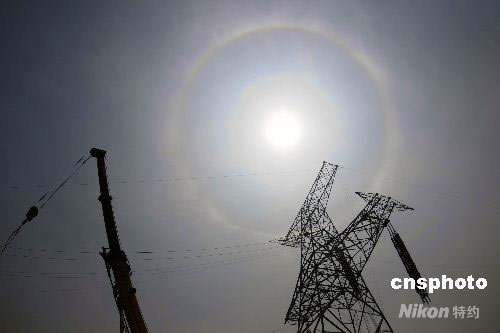 5月10日上午10時許,河南孟州黃河灘區上空出現日暈奇觀,持續至11時30分左右散去。日暈是一種比較罕見的天象,多出現在春夏季節。它是日光通過云層中的冰晶時,經折射而形成的光現象,圍繞太陽環形,呈彩色。中新社發 楊帆 攝