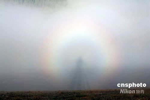 6月28日,筆者在阿勒泰市托勒海特夏牧場拍攝晨霧時遇到難得一見的佛光奇觀。“佛光”大約持續了十幾分鐘后隱去。據了解,“佛光”是由于當地水氣較大,光線遇到這些水氣折射形成。托勒海特夏牧場位于阿勒泰市西北140公里,與喀納斯景區僅一山之隔。中新社發 史志強 攝