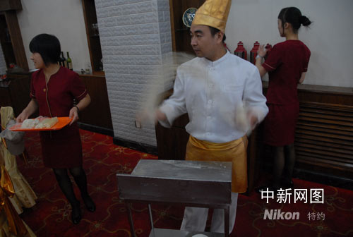蘭州人吃牛肉面吃出了名堂,吃上了癮。如今,蘭州市的每條街巷,無論大小,至少都有一兩家牛肉面館。黃河岸邊的古城蘭州,彌漫在大街小巷的,永遠(yuǎn)有那股牛肉面的清香。“蘭州人三天不來個‘牛大碗’就心火難捺”。聽起來有點夸張,不過,牛肉面確實已成為蘭州人生活中不可或缺的一部分。別以為煮面條加上牛肉片就是牛肉面了。蘭州牛肉面的精致與吃法考究令人瞠目。觀看拉面好像是欣賞雜技表演,拉面師傅操起面節(jié),一搓一拉,連抻數(shù)次,即變戲法似地拉繞出一碗細(xì)長的面條拉到最后時的“一拉一閃”又仿佛是舞蹈演員在揮舞著彩帶。王紅綱 攝