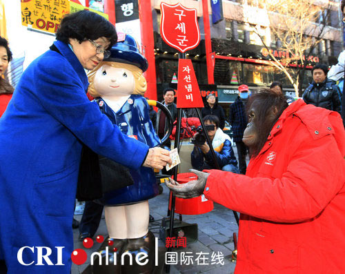 2008年12月15日,一只來自韓國高陽一家動物園的猩猩當日現身首爾明洞街頭,為慈善組織“救世軍”募捐!熬仁儡姟北驹鲁蹰_始在韓國各大城市街頭接受社會捐贈。