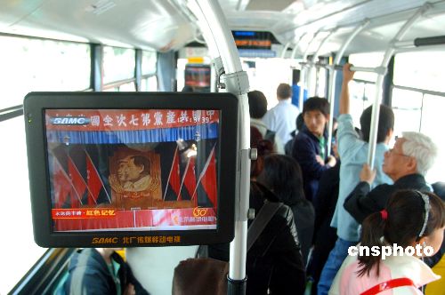 10月21日,北京公共汽車(chē)上的電視屏幕播放中共七大的紀(jì)錄影片。當(dāng)日,中共十七大完成各項(xiàng)議程后在北京人民大會(huì)堂閉幕。中新社發(fā) 廖攀 攝