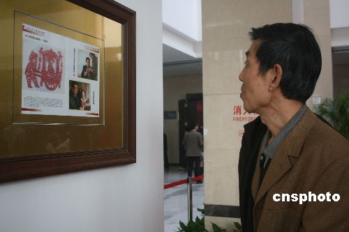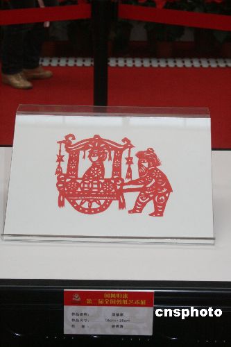 2007年2月17日,農歷年三十,胡錦濤總書記到甘肅定西市安定區大坪村看望慰問當地干部群眾。在村民李彩家里,總書記問年景、看水窖、察糧倉,同主人親切拉家常。當總書記看到女主人在剪窗花時,也興致勃勃地拿起剪刀,剪起窗花。總書記很快剪好一幅鄉土氣息濃郁的《回娘家》窗花?倳浀恼淦芳炎鞅焕畈始艺洳。得知“八藝節”在武漢舉行,經李彩家人同意,中國剪紙學會會員、定西市剪紙協會副會長劉偉將李彩大兒子李宏偉珍藏的胡錦濤總書記剪紙《回娘家》,用特快專遞到武漢“第二屆國際剪紙藝術展”組委會。中新社發 李長林 攝