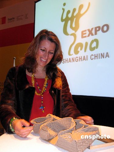 圖為上海世博會“西班牙館”領(lǐng)銜設(shè)計師本內(nèi)德塔女士與首次曝光的“西班牙館”模型。