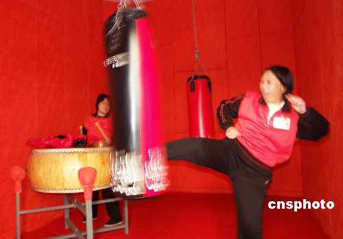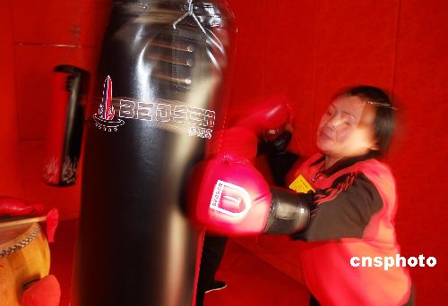 2007年11月14日,勞教人員在河南省女子勞教所的宣泄室內用力擊打沙袋,宣泄心中的苦惱。宣泄室是該所勞教人員心理矯治中心新開設的心理治療項目,室內的墻壁都用厚厚的海棉包裹,并配備了沙袋、鑼鼓等供勞教人員使用,針對一些內向的學員,起到了很好地的心理治療作用。據介紹,宣泄室只是心理治療的一個環節,只有與其他的心理矯治手段相配合才能真正緩解勞教人員的心理壓力,樹立起重樹新生的信心。中新社發 馬健 攝