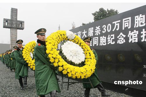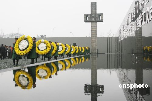 2007年12月12日,在侵華日軍南京大屠殺遇難同胞紀(jì)念館集會(huì)廣場(chǎng)上,武警南京市支隊(duì)國(guó)旗護(hù)衛(wèi)隊(duì)隊(duì)員正在進(jìn)行向南京大屠殺遇難同胞敬獻(xiàn)花圈儀式排練。12月13日是南京大屠殺紀(jì)念日,南京市將在此舉行悼念侵華日軍南京大屠殺30萬(wàn)同胞遇難70周年紀(jì)念儀式暨侵華日軍南京大屠殺遇難同胞紀(jì)念館擴(kuò)建工程竣工儀式。中新社發(fā) 韓華 攝