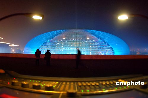12月20日,北京國(guó)家大劇院測(cè)試首個(gè)演出季的外部燈光效果,藍(lán)色的燈光和背后高功率射燈將國(guó)家大劇院裝扮得夢(mèng)幻迷人。據(jù)悉,本次開(kāi)幕國(guó)際演出季將從2007年12月22日持續(xù)到2008年4月6日,期間將有78個(gè)劇目、180場(chǎng)精彩演出在這里隆重上演,其中三分之一為國(guó)外劇目,涵蓋了歌劇、舞劇、音樂(lè)會(huì)、話劇、民族戲曲五大藝術(shù)門類,預(yù)計(jì)接納觀眾30萬(wàn)人次。中新社發(fā) 廖攀 攝