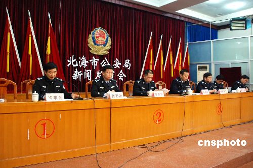 2007年12月30日,廣西北海市一家娛樂城經理及其手下十余名打手,以暴力公然阻礙警務人員抓捕嫌犯,并將兩名執勤警員毆打致傷。北海警方1月3日宣布,制造這宗中國罕見的暴力襲警事件的16名兇徒,目前已全部被抓捕歸案,并被以涉嫌妨害公務罪刑事拘留。圖為警方召開的新聞發布會現場。 中新社發 龐博斌 攝
