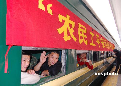 一月八日下午,廣州火車站發(fā)出今春首趟珠三角農(nóng)民工平安返鄉(xiāng)專列,一千七百多名農(nóng)民工乘專列途經(jīng)廣東、湖南、湖北、河南四省,開往河南省會(huì)城市鄭州。中新社發(fā) 柯小軍 攝
