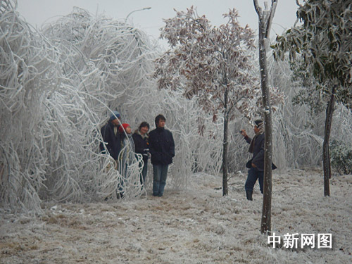 在海拔約八百米的京珠高速公路廣東韶關乳源、樂昌路段,沿途山野一片白茫茫,早些天仍綠葉婆娑的樹木也披上銀妝,掛上冰飾。京珠高速樂昌云巖服務區內,幾個年輕人在冰清玉潔的樹掛前留戀往返。