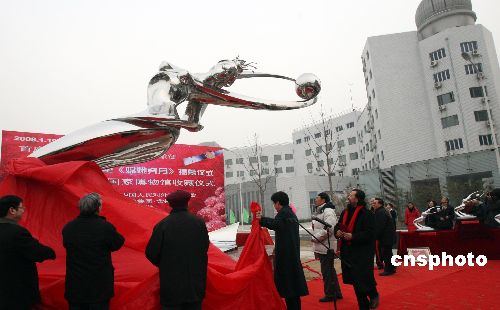 1月19日,中國科學院辦公廳、中國國家博物館、國家天文臺在北京中國科學院奧運村科技園聯合舉行大型雕塑作品“嫦娥奔月”落成揭幕儀式,同時舉行該作品由中國國家博物館永久收藏儀式。雕塑“嫦娥奔月”由中國著名雕塑藝術家遙遠先生創作完成,聯手四川舍得酒業集團贈送中國科學院。中新社發 錢興強 攝
