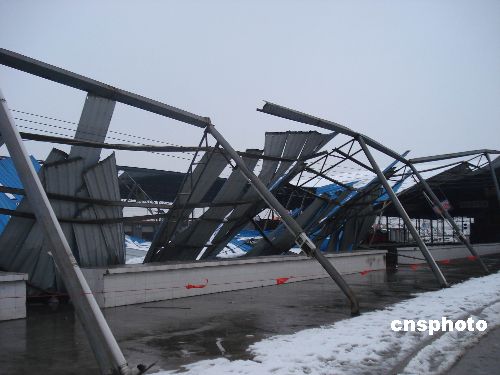 2008年1月20日凌晨,由于連日的暴雪,導致安徽省合肥市包河苑農貿市場上千平方米蔬菜大棚被雪壓塌。由于連降暴雪,安徽合肥等地,不少工廠倉庫和農貿市場的簡易大棚被雪壓塌,目前沒有造成人員傷亡。中新社發 何保豐 攝