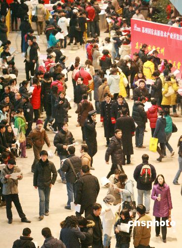 1月26日,2008年蘇州春季人才交流大會暨畢業生雙選會開場。據了解,本次“雙選會”有近500家用人單位進場招聘,為求職者提供12000多個職位。其中事業單位需求崗位1300余個、企業單位需求崗位10900多個,博士、碩士生及本科以上學歷占需求總量的53%以上。據主辦方稱,當日進場人數可逾6萬。中新社發 蘇秀 攝