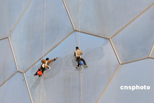 兩名工人正在清洗北京奧運會游泳館“水立方”的外墻膜。