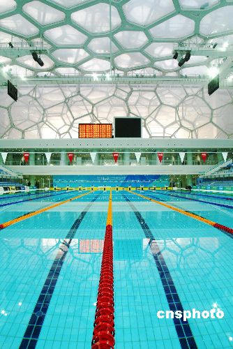 1月26日,北京奧林匹克公園內的北京奧運會游泳館“水立方”,進行各項設施調試,以迎接1月31日在這里舉行的“好運北京”中國游泳公開賽測試賽。中新社發 富田 攝