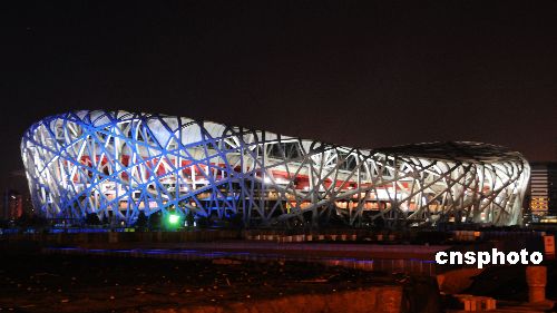 1月29日晚,北京國家體育場(鳥巢)景觀燈亮了,與國家游泳中心(水立方)遙相輝映。中新社發 馮軍(北京) 攝